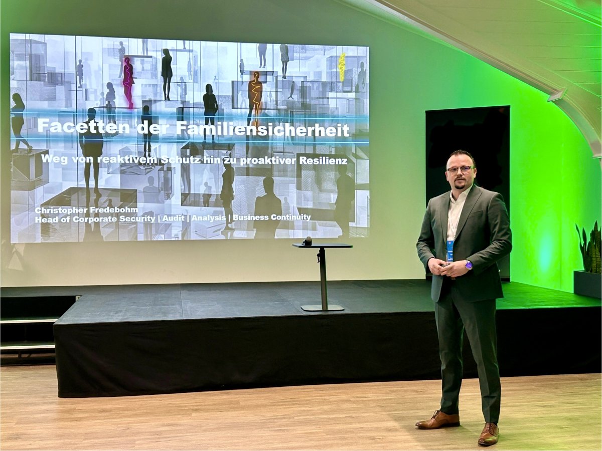 Ein erstes zentrales Thema der Veranstaltung war die Bedeutung der Familiensicherheit im Kontext der Unternehmenssicherheit. Christopher Fredebohm, Bereichsleiter Unternehmenssicherheit & Revision bei Dirk Rossmann, verdeutlichte in seinem Vortrag, dass Sicherheitskonzepte nicht nur auf die Unternehmenslenkenden selbst, sondern auf deren gesamte Familie ausgeweitet werden müssen. Neben dem Vorstand sind auch Angehörige wie Kinder, Großeltern und weitere Familienmitglieder potenziellen Risiken ausgesetzt. Physische Sicherheit umfasst dabei Personen, Residenzen und Vermögenswerte. Besonders betont wurde, dass Angriffe häufig über die „Flanken“ erfolgen – also über weniger geschützte Familienmitglieder oder deren Umfeld.