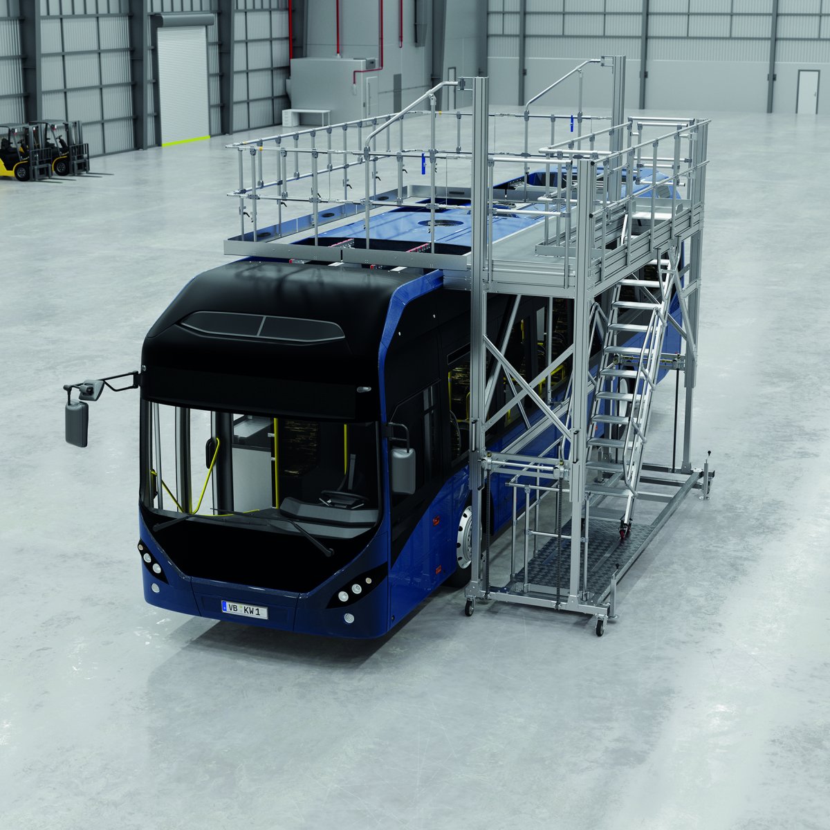 Eine höhenverstellbare und fahrbare Arbeitsplattform mit Geländerkorb schafft optimale Bedingungen. Mit einem Plattformhöhenbereich von 2.700 bis 3.700 Millimetern kann sie an unterschiedlichen Bustypen eingesetzt werden, ohne dass separate Systeme vorgehalten werden müssen. Die Höhenverstellung wird über eine wartungsarme Zahnstangenmechanik realisiert, die per Handkurbel bedient wird. Alternativ kann ein handelsüblicher Akkuschrauber verwendet werden. Diese mechanische Lösung verbindet Robustheit mit Flexibilität und vermeidet den Einsatz komplexer Antriebssysteme.