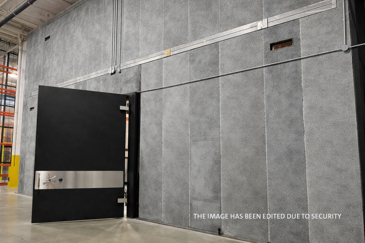 At the centre of the installation is a custom-engineered vault constructed using Class 2 panels in accordance with Health Canada directives. The structure measures approximately 27 feet in height, 39 feet in width and 66 feet in depth, with a total of 232 panels and an overall weight exceeding 750,000 pounds.