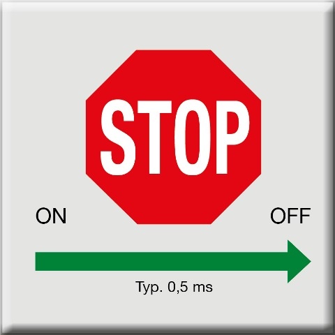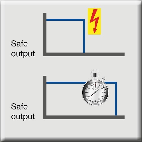 Eine weitere Neuerung ist die parametrierbare Abschaltverzögerung der sicheren Ausgänge. Wird ein Hardwarefehler bzw. Kurzschluss am Eingang einer Sicherheitssteuerung entdeckt, so wird normalerweise sofort in den sicheren Zustand geschaltet. Die Ausgänge werden also sofort abgeschaltet – die kann mitunter aber zu gefährlichen Situationen führen, wenn z. B. gerade ein größeres Teil an einem Roboterarm bewegt wird. Durch die aufkommende große Fliehkraft könnte sich dieses lösen und somit Personen im Umfeld gefährden oder sogar verletzen.